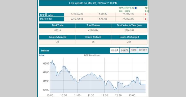 লেনদেনে অংশ নেয়া ১৭৪ কোম্পানির মধ্যে দর বেড়েছে ৬৯, কমেছে ৬৫ এবং অপরিবর্তিত আছে ৪০ কোম্পানির শেয়ারের দাম।