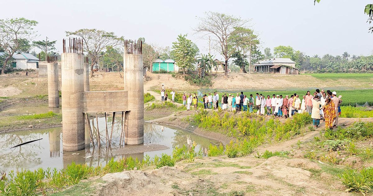 নিরাপত্তাহীনতার অভিযোগও তুলেছেন স্থানীয়রা। বলেন, নদীর দুই পাশের পিলারসহ মাঝে দুই স্থানে দুটি করে চারটি পিলার তোলা রয়েছে। সব জায়গাতেই রড বেরিয়ে আছে। সেতু নির্মাণের বা সতর্কতামূলক কোনো সাইনবোর্ডও নেই।