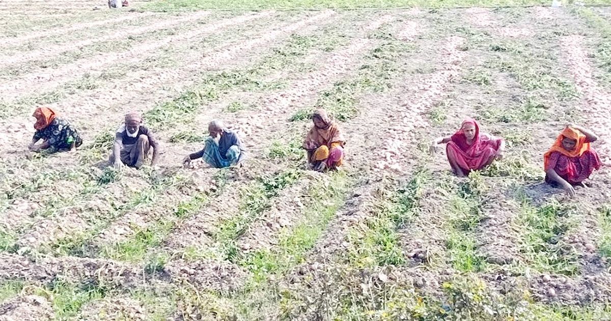 আলু তুলতে ব্যস্ত সময় পার করছেন শ্রমিকরা। শনিবার সকালে কালাই উপজেলার তিশরাপাড়ার মাঠ থেকে তোলা। ছবি: দৈনিক বাংলা