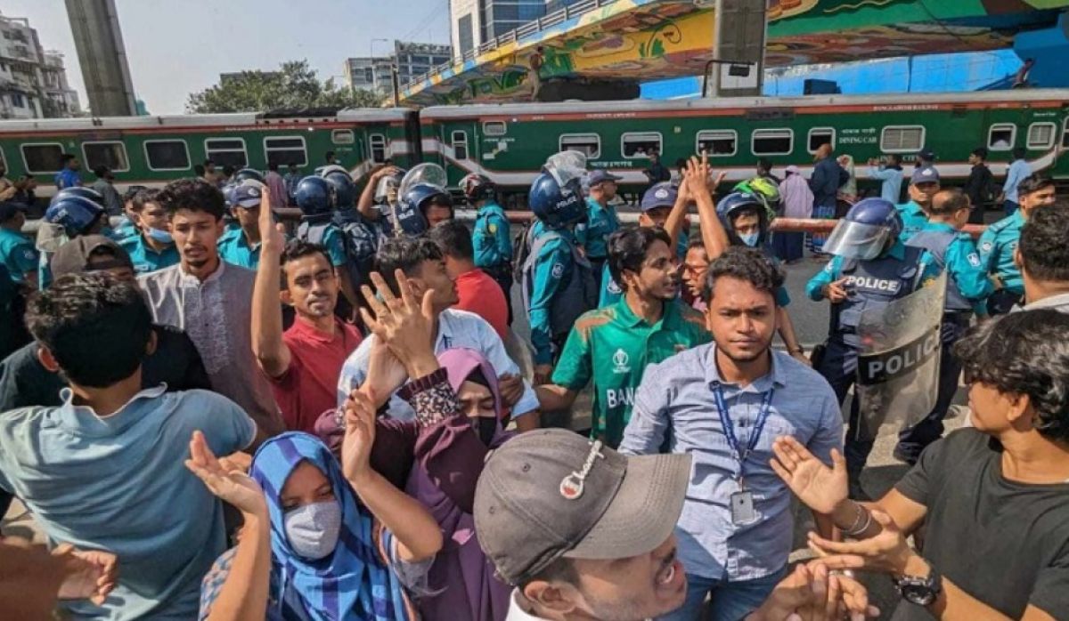 সকাল সোয়া ১১টার দিকে তিতুমীর কলেজ ক্যাম্পাস থেকে শতশত শিক্ষার্থীরা মিছিল বের করেন। মিছিলটি মহাখালী আমতলী মোড় হয়ে সাড়ে ১১টার দিকে মহাখালী রেলক্রসিং এলাকায় অবস্থান নেয়। এর কিছুক্ষণ পরেই কমলাপুর স্টেশনের দিকে যাচ্ছিল নোয়াখালী থেকে আসা আন্তনগর ট্রেন উপকূল এক্সপ্রেস। মহাখালী রেলক্রসিং অতিক্রম করার সময় শিক্ষার্থীরা সেটি থামানোর চেষ্টা করে। তবে ট্রেনটি না থেমে গতি কমিয়ে চলতে থাকলে শিক্ষার্থীরা সেটি লক্ষ্য করে ইটপাটকেল নিক্ষেপ করন। এতে ট্রেনের কয়েকটি জানালার কাচ ভেঙে যায়। আহত হন কয়েকজন যাত্রীসহ এক শিশু। তবে আহত যাত্রী ও শিশুটির পরিচয় জানা যায়নি।