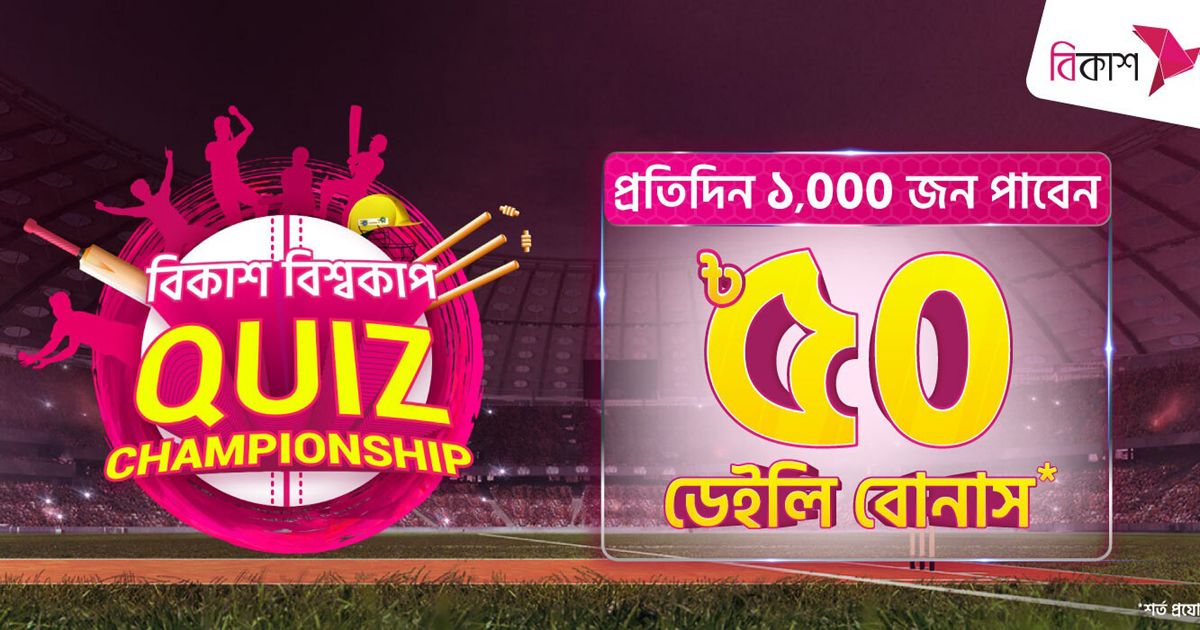 বিশ্বকাপ ক্রিকেট উপলক্ষে কুইজে অংশ নিয়ে প্রতিদিন ১০০০ জন বিকাশ গ্রাহক পাচ্ছেন ৫০ টাকা করে পুরস্কার। ক্রিকেট সম্পর্কিত সহজ ৩টি প্রশ্নের উত্তর দ্রুততম সময়ে দিয়ে এবং অ্যাপ থেকে একটি নির্দিষ্ট লেনদেন করে এ পুরস্কার পাওয়া যাচ্ছে। আগামী ২৫ অক্টোবর পর্যন্ত গ্রাহকরা এই কুইজে অংশ নিতে পারবেন।