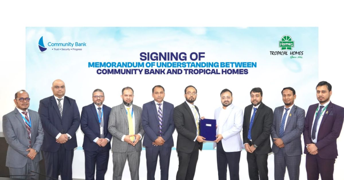 কমিউনিটি ব্যাংক বাংলাদেশ পিএলসি এবং ট্রপিক্যাল হোমস লিমিটেড- রিয়েল এস্টেট ব্যবসায়ে ঋণ সুবিধা প্রদান ও পারস্পরিক সহযোগিতা বৃদ্ধির লক্ষ্যে সম্প্রতি একটি সমঝোতা স্মারক (এমওইউ) স্বাক্ষর করেছে। ব্যাংকের হেড অফিসে আয়োজিত অনুষ্ঠানে দুই প্রতিষ্ঠানের শীর্ষ নির্বাহীরা চুক্তিতে স্বাক্ষর করেন।