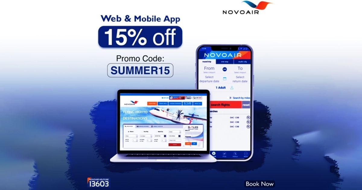 নভোএয়ারের ওয়েবসাইট ও মোবাইল অ্যাপ থেকে টিকেটের মূল্যে ১৫ শতাংশ ছাড়ের সুবিধা পাবেন। ছবি: বিজ্ঞপ্তি
