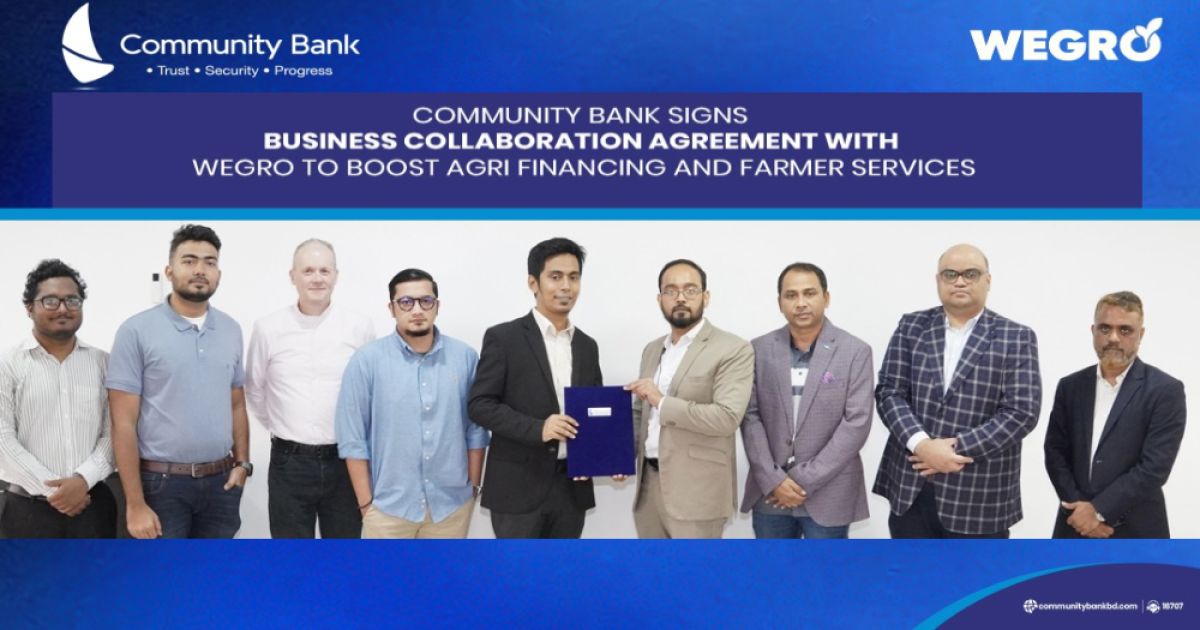 কৃষক ও কৃষি খাতের ক্ষুদ্র ও মাঝারি উদ্যোক্তাদের জীবনমান উন্নয়ন এবং সহজে আর্থিক সেবা পৌঁছে দেওয়ার লক্ষ্য নিয়ে কমিউনিটি ব্যাংক বাংলাদেশ পিএলসি ও উইগ্রো টেকনোলজিস লিমিটেডের মধ্যে ব্যবসায়িক সহযোগিতা চুক্তি স্বাক্ষরিত হয়েছে।