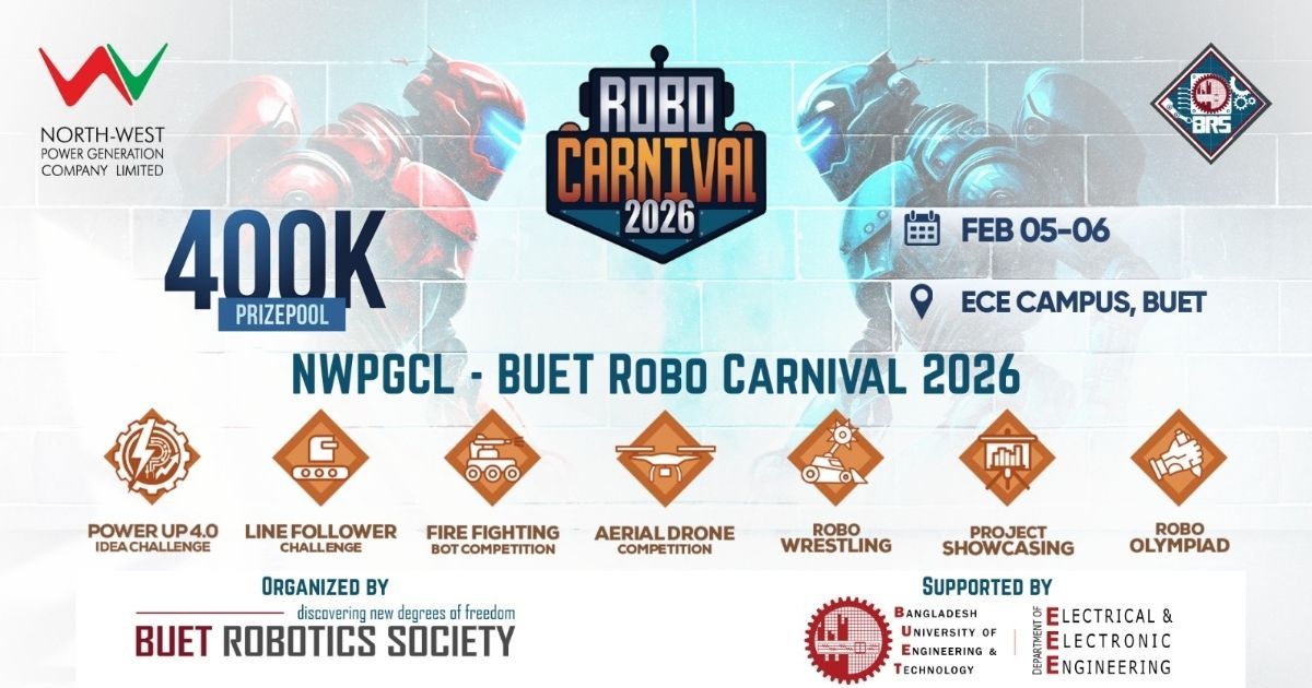 বুয়েটে দুই দিনব্যাপী ‘এনডব্লিউপিজিসিএল-বুয়েট রোবো কার্নিভাল ২০২৬’ শুরু হচ্ছে