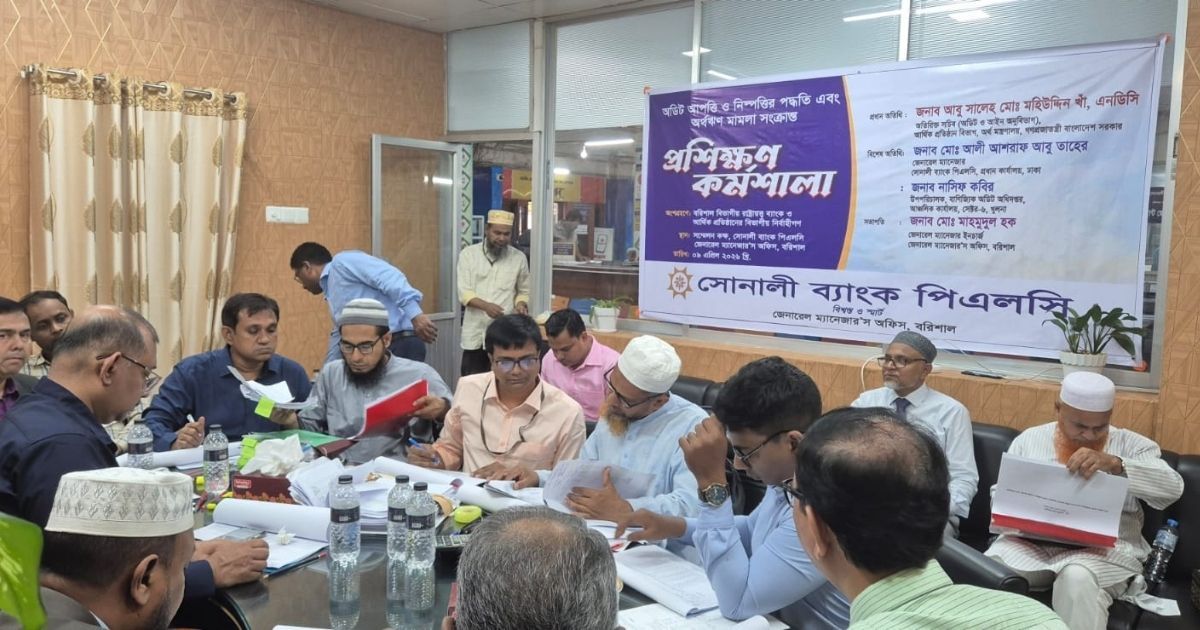সোনালী ব্যাংক পিএলসির উদ্যোগে অডিট আপত্তি ও নিষ্পত্তির পদ্ধতি এবং অর্থঋণ মামলা বিষয়ক এক প্রশিক্ষণ কর্মশালা অনুষ্ঠিত হয়েছে। ৯ এপ্রিল বৃহস্পতিবার সোনালী ব্যাংক পিএলসি, জেনারেল ম্যানেজার’স অফিস বরিশালের সম্মেলন কক্ষে এ কর্মশালা অনুষ্ঠিত হয়।