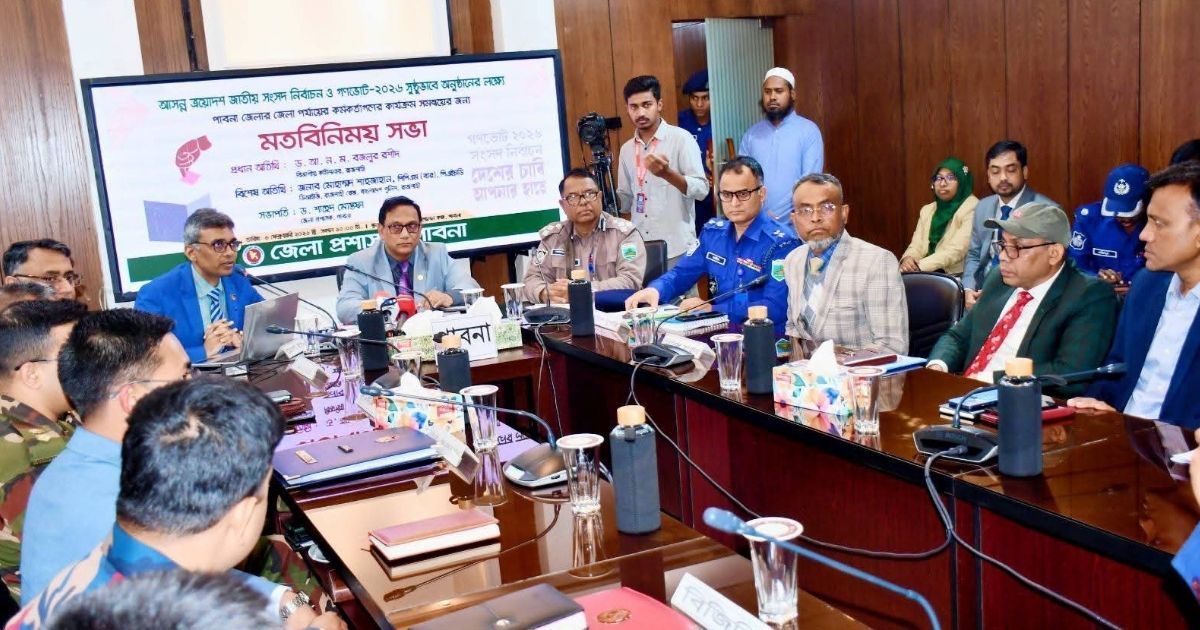 আসন্ন ত্রয়োদশ জাতীয় সংসদ নির্বাচন ও গণভোট-২০২৬ সুষ্ঠু, নিরপেক্ষ ও উৎসবমুখর পরিবেশে অনুষ্ঠানের লক্ষ্যে পাবনায় জেলা পর্যায়ের কর্মকর্তাদের কার্যক্রম সমন্বয়ের জন্য এক গুরুত্বপূর্ণ মতবিনিময় সভা অনুষ্ঠিত হয়েছে। মঙ্গলবার (৩ ফেব্রুয়ারি) সকালে পাবনা জেলা প্রশাসক কার্যালয়ের সম্মেলন কক্ষে জেলা প্রশাসনের আয়োজনে এই সভা অনুষ্ঠিত হয়।