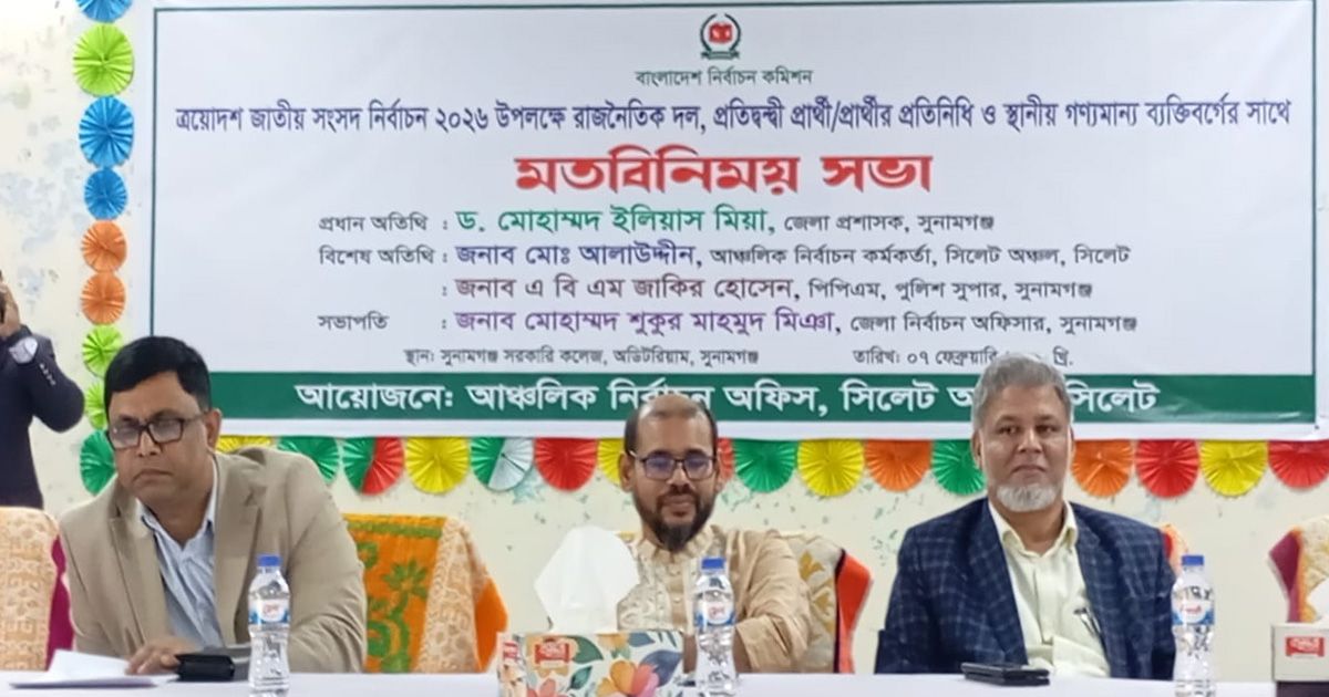 ত্রয়োদশ জাতীয় সংসদ নির্বাচন ২০২৬ উপলক্ষে রাজনৈতিক দল, প্রতিদ্বন্দ্বী প্রার্থী ও প্রার্থীর প্রতিনিধি এবং স্থানীয় গণ্যমান্য ব্যক্তিদের সাথে মতবিনিময় সভা অনুষ্ঠিত হয়েছে। শনিবার (৭ ফেব্রুয়ারি) সকাল ১১ টায় সুনামগঞ্জ সরকারি কলেজ অডিটোরিয়ামে সিলেট আঞ্চলিক নির্বাচন অফিসের আয়োজনে মতবিনিময় আয়োজনে সভা অনুষ্ঠিত হয়।