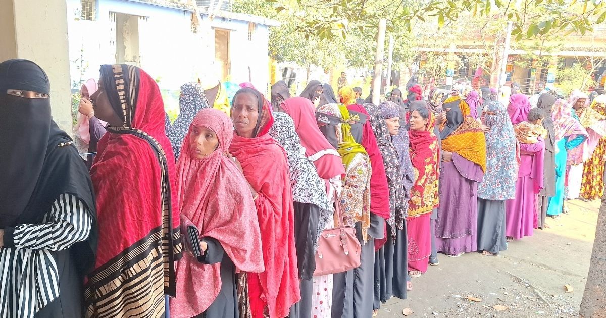 বৃহস্পতিবার (১২ ফেব্রুয়ারি) নওগাঁর রাণীনগর উপজেলার সরকারি মডেল পাইলট মডেল উচ্চ বিদ্যালয়ে বেলা ১১টায় নারীদের দীর্ঘ লাইন দেখা গেছে।