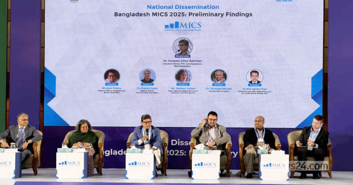 ইউনিসেফ ও অন্যান্য অংশীদারদের সহযোগিতায় বাংলাদেশ পরিসংখ্যান ব্যুরো দেশে শিশু ও নারীদের ওপর পরিচালিত সবচেয়ে বিস্তারিত জরিপ এমআইসিএস-২০২৫ এর প্রাথমিক ফলাফল প্রকাশ করেছে। বিবিএসের মহাপরিচালক মোহাম্মদ মিজানুর রহমান এবং বাংলাদেশে ইউনিসেফের প্রতিনিধি রানা ফ্লাওয়ার্স অনুষ্ঠানে উপস্থিত ছিলেন।