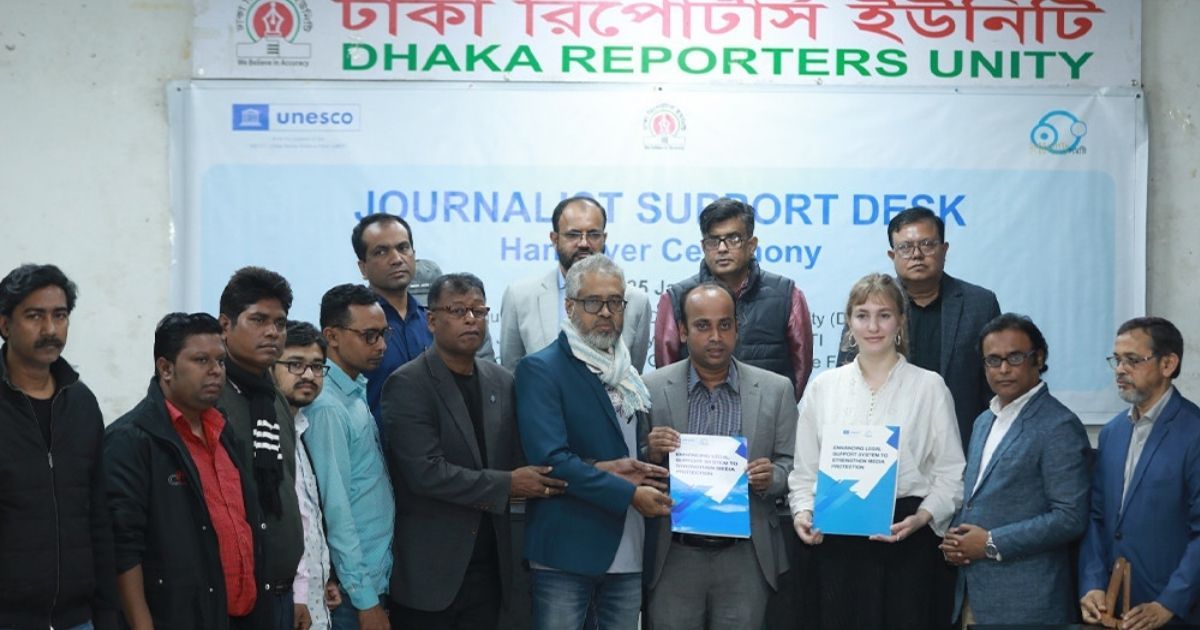 অনুষ্ঠানে ডিআরইউর সভাপতি আবু সালেহ আকনের সভাপতিত্বে বিশ্বজুড়ে সাংবাদিকদের আইনি হয়রানি ও ঝুঁকি মোকাবিলায় ইউনেসকোর প্রতিনিধি লিনা ফক্স গ্লোবাল মিডিয়া ডিফেন্স ফান্ডের কার্যকর ভূমিকা নিয়ে আলোচনা করেন। ডিআরইউ সাধারণ সম্পাদক মাইনুল হাসান সোহেল জানান, এই নতুন ডেস্কের মাধ্যমে নির্যাতিত সাংবাদিকদের আইনি সহায়তা প্রদান আরও সুসংগঠিত হবে। সংগঠনের সভাপতি আবু সালেহ আকন সাংবাদিকদের বেতনহীন দুরবস্থা এবং কর্মক্ষেত্রে নিপীড়ন নিয়ে গভীর উদ্বেগ প্রকাশ করে পেশাদার স্বার্থে সবাইকে ঐক্যবদ্ধ হওয়ার আহ্বান জানান। বিএফইউজে সভাপতি ওবায়দুর রহমান শাহীন এবং ডিইউজে সভাপতি মো. শহীদুল ইসলামসহ বিভিন্ন সাংবাদিক সংগঠনের শীর্ষ নেতৃবৃন্দ এই অনুষ্ঠানে সংহতি প্রকাশ করে বক্তব্য দেন। ডিআরইউর কার্যনির্বাহী কমিটির নেতৃবৃন্দ ও জ্যেষ্ঠ সাংবাদিকরা এই সুরক্ষা নিশ্চিতকরণ উদ্যোগে উপস্থিত ছিলেন।