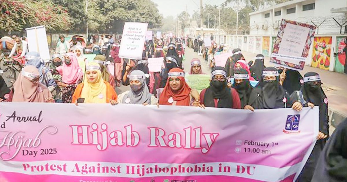 বিশ্ব হিজাব দিবস উপলক্ষে ঢাকা বিশ্ববিদ্যালয়ে (ঢাবি) প্রথমবারের মতো হিজাব র্যালি হয়েছে। ‘প্রটেস্ট অ্যাগেইনস্ট হিজাবোফোবিয়া-ঢাকা ইউনিভার্সিটি’ নামে একটি প্ল্যাটফর্ম র্যালিটির আয়োজন করে। রোববার (১ ফেব্রুয়ারি) দুপুর ১২টার দিকে ভিসি চত্বর থেকে র্যালিটি শুরু হয়। সেখান থেকে টিএসসি হয়ে রাসেল টাওয়ার ঘুরে আবার রাজু ভাস্কর্যে গিয়ে শেষ হয়। এরপর সেখানে সংক্ষিপ্ত সমাবেশ হয়।