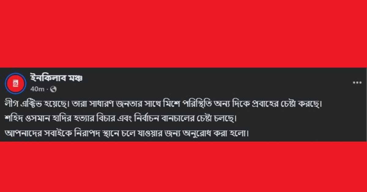 শরিফ ওসমান হাদির হত্যার বিচার প্রক্রিয়া বাধাগ্রস্ত করা এবং আসন্ন নির্বাচন বানচালের গভীর ষড়যন্ত্র চলছে এমন আশঙ্কায় সংগঠনটি তাদের কর্মী ও সাধারণ সমর্থকদের দ্রুত নিরাপদ স্থানে চলে যাওয়ার নির্দেশ দিয়েছে। পোস্টে অত্যন্ত গুরুত্বের সাথে সতর্ক করে বলা হয়, ‘লীগ অ্যাক্টিভ হয়েছে। তারা সাধারণ জনতার সঙ্গে মিশে পরিস্থিতি অন্য দিকে প্রবাহের চেষ্টা করছে। শহীদ ওসমান হাদির হত্যার বিচার এবং নির্বাচন বানচালের চেষ্টা চলছে। আপনাদের সবাইকে নিরাপদ স্থানে চলে যাওয়ার জন্য অনুরোধ করা হলো।’