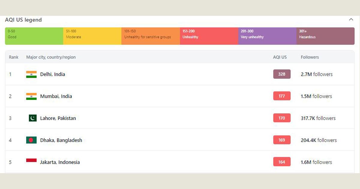 এ ছাড়া ১৭৭ স্কোর নিয়ে ভারতের মুম্বাই দ্বিতীয়, ১৭০ স্কোরে পাকিস্তানের লাহোর তৃতীয় স্থানে। এ ছাড়া ১৬৪ স্কোরি নিয়ে ইন্দোনেশিয়ার জাকার্তা ছিল পঞ্চম স্থানে।