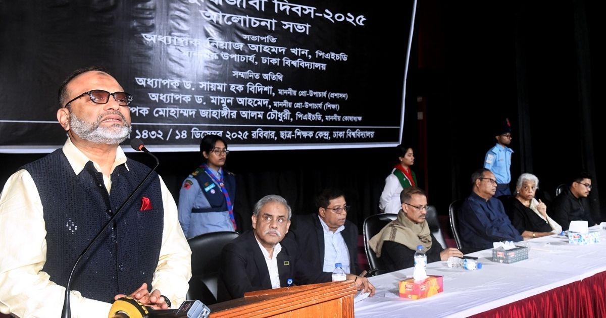 ঢাকা বিশ্ববিদ্যালয়ের উপাচার্য অধ্যাপক ড. নিয়াজ আহমদ খান বলেন, ১৯৫২, ১৯৬৯, ১৯৭১, ১৯৯০ ও ২০২৪-এর ঐতিহাসিক ঘটনাগুলো পরস্পরবিরোধী নয় বরং এগুলো বাংলাদেশের জাতীয় সত্তা ও ইতিহাস নির্মাণ করেছে। এসব ঘটনাকে মুখোমুখি দাঁড় করিয়ে বিভাজন সৃষ্টির যে রাজনৈতিক অপচেষ্টা চলছে, সে ব্যাপারে জাতিকে সচেতন ও ঐক্যবদ্ধ থাকতে হবে। শহিদ বুদ্ধিজীবী দিবস উপলক্ষ্যে আজ ১৪ ডিসেম্বর ২০২৫ রবিবার ছাত্র-শিক্ষক কেন্দ্র মিলনায়তনে আয়োজিত আলোচনা সভায় সভাপতির বক্তব্যে তিনি একথা বলেন।