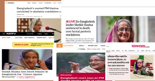 বার্তা সংস্থা রয়টার্সের শিরোনামে বলা হয়েছে, শিক্ষার্থীদের ওপর নির্যাতনের দায়ে বাংলাদেশের ক্ষমতাচ্যুত প্রধানমন্ত্রী হাসিনার মৃত্যুদণ্ড। ব্রিটিশভিত্তিক গণমাধ্যম দ্য গার্ডিয়ান শিরোনাম করেছে, মানবতাবিরোধী অপরাধের দায়ে বাংলাদেশের ক্ষমতাচ্যুত প্রধানমন্ত্রী শেখ হাসিনার মৃত্যুদণ্ড।