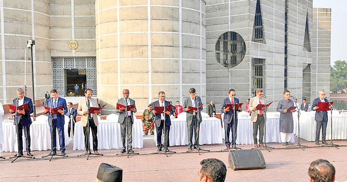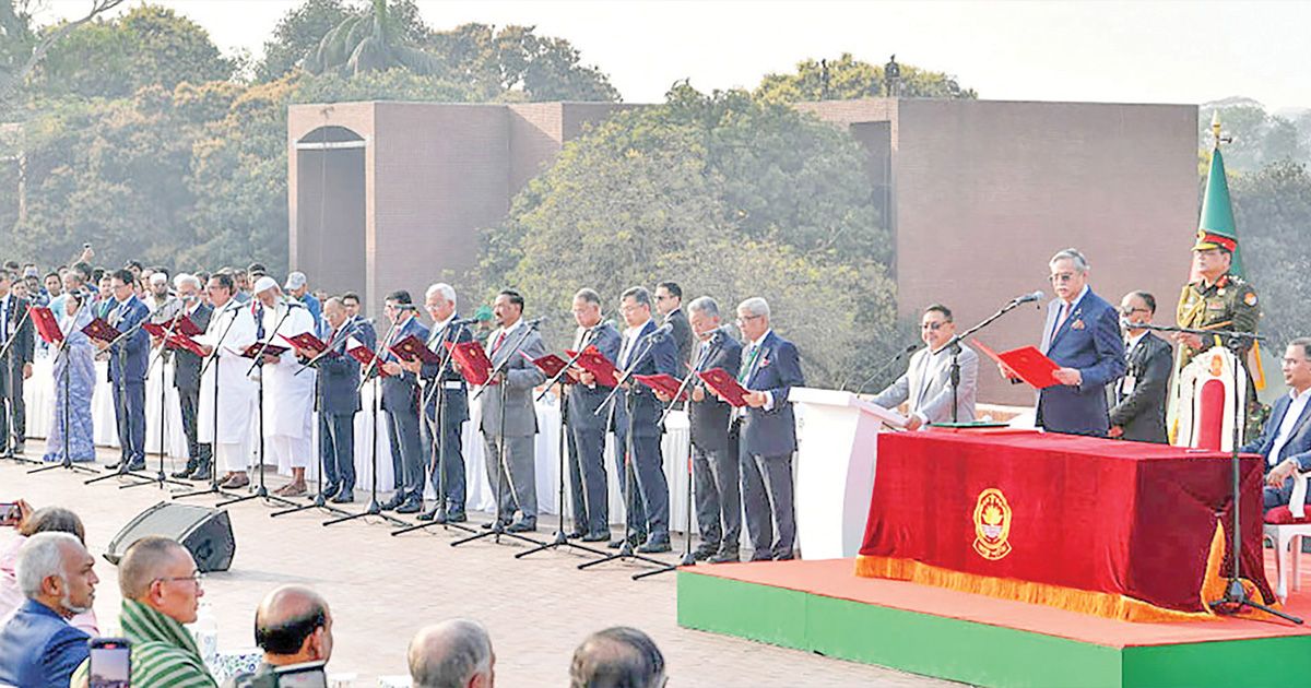 বাংলাদেশের ইতিহাসে এক নতুন রাজনৈতিক অধ্যায়ের সূচনা করে আজ মঙ্গলবার বিকেলে শপথ নিয়েছে বিএনপি নেতৃত্বাধীন নতুন সরকারের মন্ত্রিসভা। বিএনপি চেয়ারম্যান তারেক রহমানের নেতৃত্বে নতুন সরকারের মন্ত্রিসভার সদস্যদের রাষ্ট্রপতি মো. সাহাবুদ্দিন তাদের শপথবাক্য পাঠ করান। মঙ্গলবার (১৭ ফেব্রুয়ারি) বিকেল সোয়া ৪টার পর জাতীয় সংসদ ভবনের দক্ষিণ প্লাজায় এই শপথগ্রহণ অনুষ্ঠান অনুষ্ঠিত হয়। এসময় নবনির্বাচিত সংসদ সদস্য, অন্তর্বর্তী সরকারের প্রতিনিধি এবং আমন্ত্রিত অতিথিরা উপস্থিত ছিলেন। এ ছাড়াও ভারত, পাকিস্তান, নেপালসহ দক্ষিণ এশিয়ার বিভিন্ন দেশের নেতারা উপস্থিত ছিলেন। ঘোষিত মন্ত্রী ও প্রতিমন্ত্রীদের মধ্যে কে কোন মন্ত্রণালয় পাচ্ছেন তা নিয়ে চলছে জল্পনা।