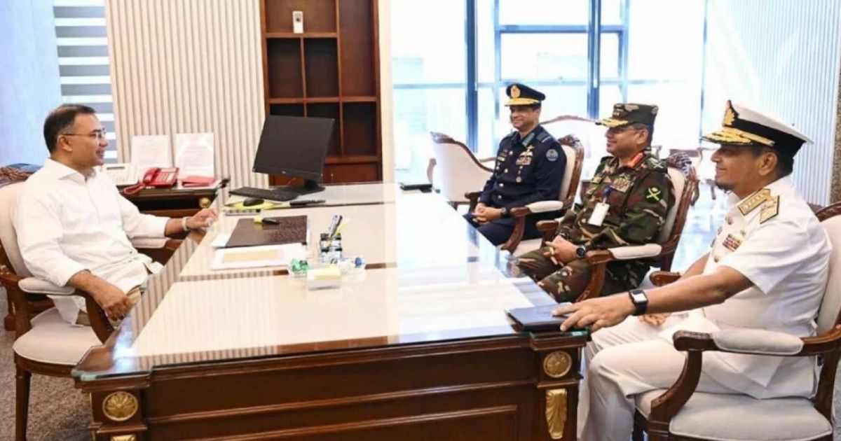 রাষ্ট্র পরিচালনার দায়িত্ব গ্রহণের পর দ্বিতীয় কর্মদিবসে জাতীয় নিরাপত্তা ও প্রতিরক্ষা ব্যবস্থাকে সর্বোচ্চ অগ্রাধিকার দিয়ে সশস্ত্র বাহিনীর শীর্ষ নেতৃত্বের সঙ্গে গুরুত্বপূর্ণ বৈঠকে মিলিত হয়েছেন প্রধানমন্ত্রী তারেক রহমান। আজ বৃহস্পতিবার সকালে সচিবালয়ে প্রধানমন্ত্রীর অস্থায়ী কার্যালয়ে এই সৌজন্য সাক্ষাৎ ও বৈঠক অনুষ্ঠিত হয়। সেনাবাহিনী প্রধান জেনারেল ওয়াকার-উজ-জামান, নৌবাহিনী প্রধান অ্যাডমিরাল মোহাম্মদ নাজমুল হাসান এবং বিমানবাহিনী প্রধান এয়ার চিফ মার্শাল হাসান মাহমুদ খাঁন প্রধানমন্ত্রীর সঙ্গে দেখা করেন এবং দেশের বর্তমান সার্বিক নিরাপত্তা পরিস্থিতি নিয়ে বিস্তারিত আলোচনা করেন।