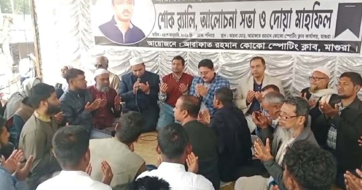 শনিবার (২৪ জানুয়ারি) শহরের ভায়না মোড়ে আরাফাত রহমান কোকো স্পোর্টিং ক্লাব কার্যালয়ে মাগুরায়-১ আসনের ধানের শীষের প্রার্থী মনোয়ার হোসেন খানের উপস্থিতিতে এই আলোচনা সভা ও দোয়া মাহফিল অনুষ্ঠিত হয়। অত্রক্লাবের সভাপতি সৈয়দ মাহবুব আলী মিল্টনের সভাপতিত্বে এবং সাধারণ সম্পাদক শরিফুল ইসলামের সঞ্চালনায় বক্তব্য রাখেন মাগুরা জেলা বিএনপির সদস্য সচিব মনোয়ার হোসেন খান ও যুগ্ম আহবায়ক মোঃ আলমগীর হোসেন।