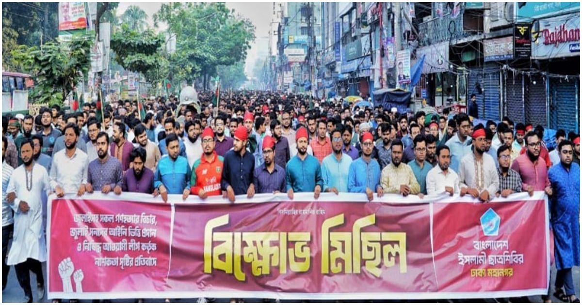 ছাত্রশিবির ঢাকা মহানগরের উদ্যোগে জুলাইসহ সকল গণহত্যার বিচার, জুলাই সনদের আইনি ভিত্তি প্রদান ও আওয়ামী লীগের নাশকতা সৃষ্টির প্রতিবাদে বিক্ষোভ মিছিল ও সমাবেশ অনুষ্ঠিত হয়েছে। আজ বৃহস্পতিবার সকাল ৭টার দিকে মিছিলটি ঢাকা কলেজ থেকে শুরু হয়ে বিভিন্ন গুরুত্বপূর্ণ সড়ক প্রদক্ষিণ করে ঢাকা বিশ্ববিদ্যালয়ের রাজু ভাস্কর্যে গিয়ে সমাবেশের মাধ্যমে শেষ হয়।