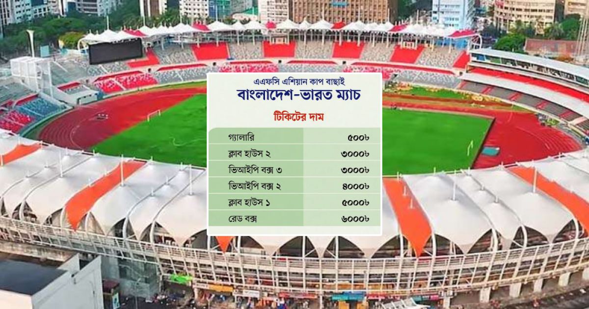 বাংলাদেশ ফুটবল ফেডারেশন (বাফুফে) টিকিটের দাম জানিয়েছে। সোমবার দুপুর ২টা থেকে টিকি বিক্রি শুরু হয়েছে। ছয় ক্যাটাগরির টিকিট পাওয়ার কথা ইভেন্ট টিকেটিং প্ল্যাটফর্ম Quicket–এ।