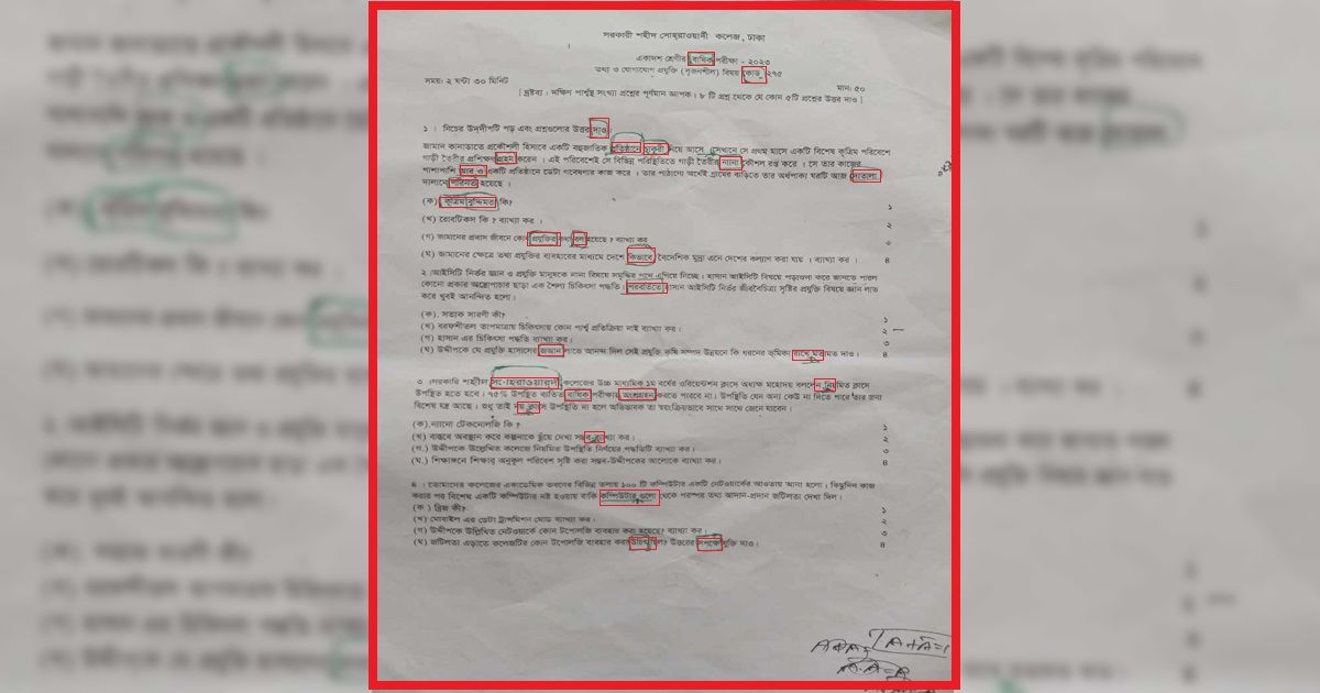 কলেজটির একাদশ শ্রেণির আইসিটি পরীক্ষার প্রশ্নপত্রে এসব ভুল পাওয়া যায় বলে জানান পরীক্ষার্থীরা। গত রোববার অনুষ্ঠিত এ বিষয়ের বার্ষিক পরীক্ষার ‘বার্ষিক’ বানানটিও ভুল লেখা হয়েছে।