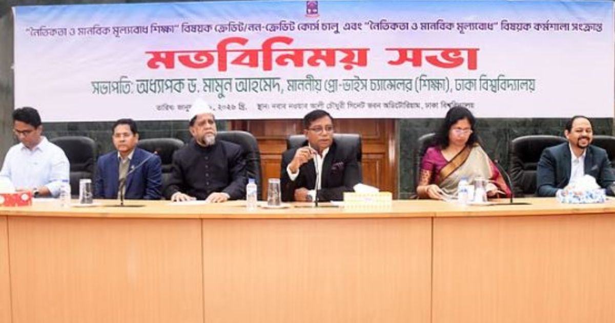 বিজ্ঞপ্তিতে আরও বলা হয়, সভায় নৈতিকতা ও মানবিক মূল্যবোধ শিক্ষাবিষয়ক কোর্স চালু এবং কর্মশালা আয়োজনবিষয়ক কমিটির বিভিন্ন প্রস্তাবনা উপস্থাপন করা হয়। কমিটির পরবর্তী কর্মপরিকল্পনা গ্রহণের ক্ষেত্রে মতবিনিময় সভার সুপারিশসমূহ বিবেচনা করার বিষয়ে সভায় সিদ্ধান্ত গৃহীত হয়। সভায় ২০২৫-২৬ শিক্ষাবর্ষ থেকে সব বিভাগ ও ইনস্টিটিউটের প্রথম বর্ষের (আন্ডারগ্র্যাজুয়েট প্রোগ্রাম) শিক্ষার্থীদের জন্য ‘নৈতিকতা ও মানবিক মূল্যবোধ শিক্ষা’ বিষয়ক একটি কোর্স চালুর সম্ভাব্যতা নিয়ে আলোচনা করা হয়। একই শিক্ষাবর্ষ থেকে সব বিভাগ ও ইনস্টিটিউটের বর্তমান শিক্ষার্থীদের জন্য চতুর্থ বর্ষ (সম্মান) ও মাস্টার্স পর্যায়ে ‘নৈতিকতা ও মানবিক মূল্যবোধ শিক্ষা’ বিষয়ক কর্মশালা আয়োজনের বিষয়েও সভায় কর্মপরিকল্পনা গ্রহণ করা হয়।