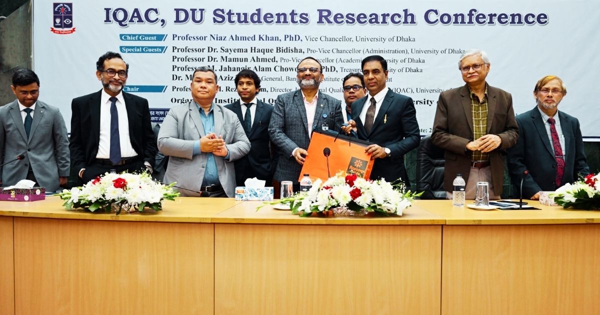 ঢাকা বিশ্ববিদ্যালয়ে প্রথমবারের মতো শিক্ষার্থী গবেষণা সম্মেলন ২৯ জানুয়ারি ২০২৬ (বৃহস্পতিবার) নবাব নওয়াব আলী চৌধুরী সিনেট ভবনে অত্যন্ত গুরুত্বের সাথে অনুষ্ঠিত হয়েছে। বিশ্ববিদ্যালয়ের ইনস্টিটিউশনাল কোয়ালিটি এ্যাসুরেন্স সেল (আইকিউএসি) আয়োজিত এই দিনব্যাপী সম্মেলনের উদ্বোধনী পর্বে প্রধান অতিথি হিসেবে উপস্থিত থেকে অনুষ্ঠানের শুভ সূচনা করেন উপাচার্য অধ্যাপক ড. নিয়াজ আহমদ খান। আইকিউএসি’র পরিচালক অধ্যাপক ড. রেজাউল ইসলামের সভাপতিত্বে আয়োজিত এই অনুষ্ঠানে বিশেষ অতিথি হিসেবে ঢাকা বিশ্ববিদ্যালয়ের প্রো-ভাইস চ্যান্সেলর (প্রশাসন) অধ্যাপক ড. সায়মা হক বিদিশা, প্রো-ভাইস চ্যান্সেলর (শিক্ষা) অধ্যাপক ড. মামুন আহমেদ এবং বাংলাদেশ ইনস্টিটিউট অব ইসলামিক থট-এর ব্যবস্থাপনা পরিচালক ড. এম আবদুল আজিজ বক্তব্য প্রদান করেন।