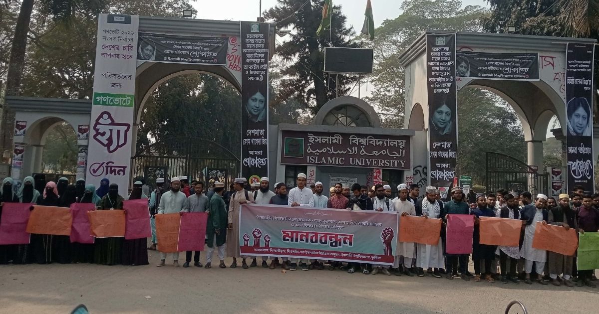 প্রভাষক নিয়োগে শিক্ষক নিবন্ধনে (আল কুরআন, আল হাদিস, আরবি সাহিত্য ও আল ফিকহ বিভাগ) বৈষম্যহীন পরীক্ষার দাবিতে মানববন্ধন করেছে কুষ্টিয়ার ইসলামী বিশ্ববিদ্যালয়ের (ইবি) শিক্ষার্থীরা।