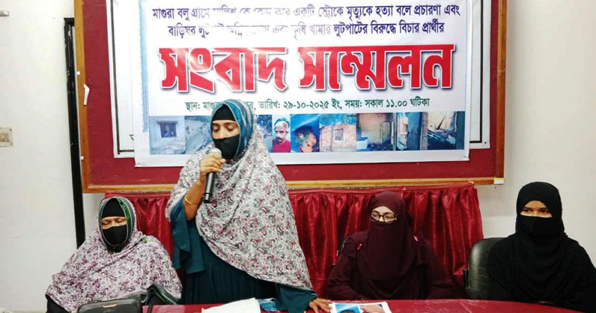 স্ট্রোকের মৃত্যুকে হত্যা বলে প্রচারণা এবং ঘরবাড়ি লুটপাট অগ্নিসংযোগ এবং কৃষি খামার লুটপাটের বিরুদ্ধে বিচার প্রার্থীর সংবাদ সম্মেলন অনুষ্ঠিত হয়েছে। মাগুরায় স্বামী ও সন্তানকে জড়িয়ে মিথ্যা হত্যা মামলা ও ঘরবাড়ি খামার ভাঙচুরের অভিযোগে মাগুরায় সংবাদ সম্মেলন করেছেন হালিমা খাতুন নামে এক গৃহবধূ। গত বুধবার সকালে মাগুরা প্রেসক্লাব মিলনায়তনে অনুষ্ঠিত সংবাদ সম্মেলনে গত ২৪ অক্টোবর শুক্রবারে সদর উপজেলার বলুগ্রামে জমিজমা নিয়ে সালিশের একপর্যায়ে বাদশা মোল্লা নামে এক ব্যক্তি হৃদরোগে আক্রান্ত হয়ে মারা যান বলে দাবি করেন তিনি। প্রতিপক্ষরা আনোয়ার হোসেন (৪৫) ও তার ছেলে আবীর হোসেনসহ (১৭) তাদের পক্ষের ১৩ জন মিলে হাতুড়ি পেটা করে বাদশা মোল্লাকে মেরে ফেলেছে বলে মিথ্যা মামলা করেছে বলে অভিযোগ করেন ভুক্তভোগী হালিমা খাতুন।