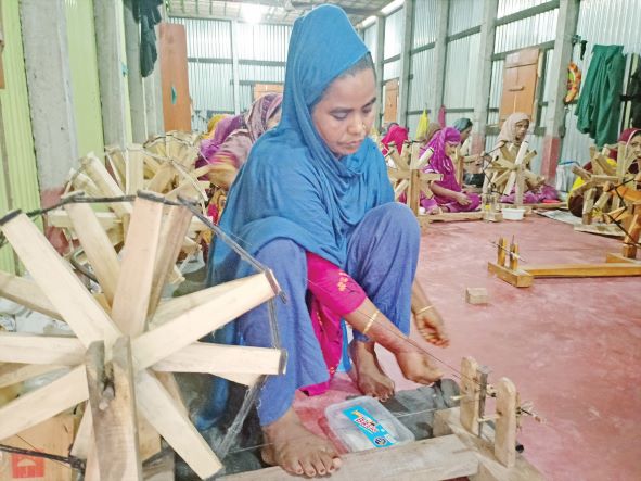 একদিকে মসলিনের ঐতিহ্য ফেরানো, অন্যদিকে গ্রামের নারীদের অর্থনৈতিক সচ্ছলতা অর্জন নিয়ে স্বপ্ন দেখছেন সংশ্লিষ্টরা। কুমিল্লার চান্দিনা উপজেলার মাধাইয়া বাসস্ট্যান্ডের পাশের গ্রাম সোনাপুর। এই গ্রামের চারটি, পাশের রামপুরের দুটি ও দোতলায় গ্রামের একটি বাড়িতে মসলিন কাপড়ের সুতা কাটা হয়। গত মঙ্গলবার দুপুরে সোনাপুর মুন্সী বাড়িতে গিয়ে দেখা যায়, একটি টিনের ঘরের দুটি কক্ষে চরকায় সুতা কাটছেন ৪৫ জন নারী। সবাই সোনাপুর গ্রামের বাসিন্দা। গ্রামে বসে অর্থ উপার্জন করতে পেরে স্বস্তির কথা জানান এসব নারীরা।