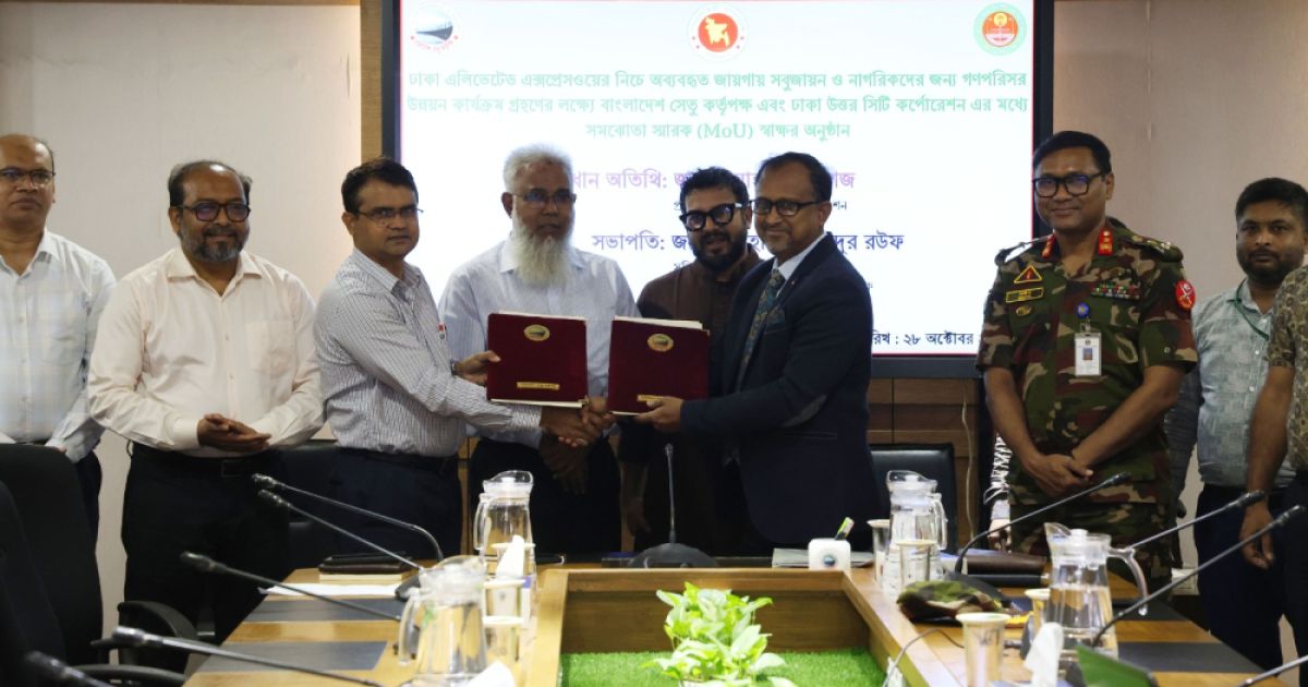 বাংলাদেশ সেতু কর্তৃপক্ষের সম্মেলন কক্ষে ঢাকা এলিভেটেড এক্সপ্রেসওয়ের নিচে অব্যবহৃত জায়গাগুলোর কার্যকর ও নান্দনিক ব্যবহার নিশ্চিত করার লক্ষ্যে সবুজায়ন ও ঢাকা মহানগরীর নাগরিকদের জন্য গণপরিসর উন্নয়ন কার্যক্রম বাস্তবায়ন করার জন্য বাংলাদেশ সেতু কর্তৃপক্ষ এবং ঢাকা উত্তর সিটি কর্পোরেশনের মধ্যে একটি দ্বিপাক্ষিক সমঝোতা স্মারক আজ স্বাক্ষরিত হয়েছে।