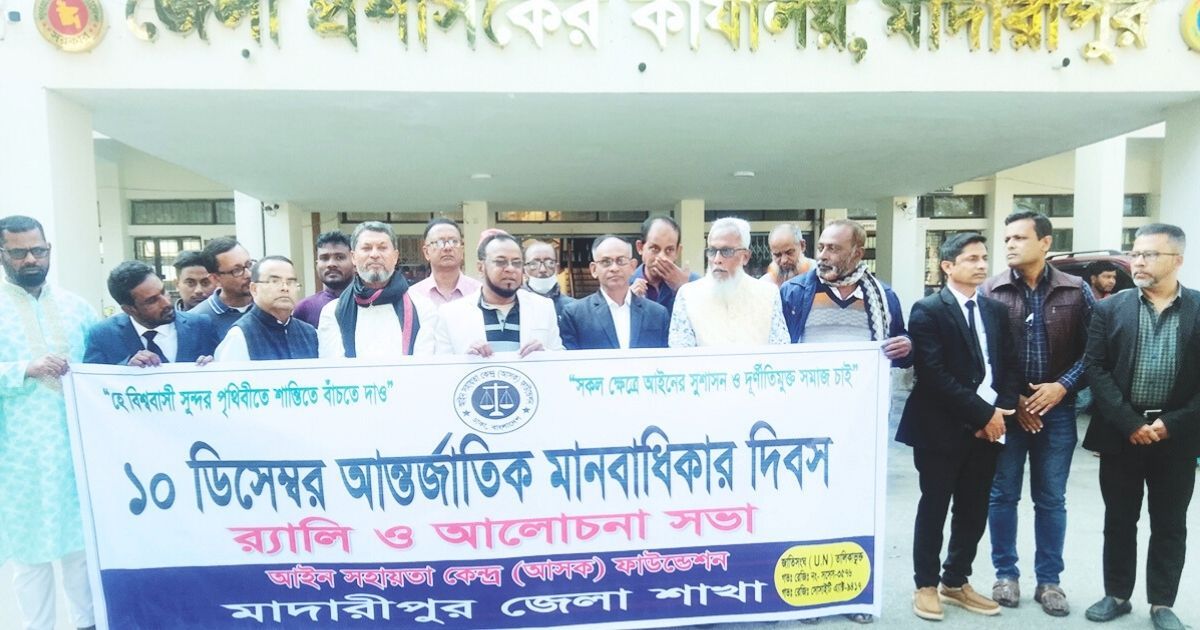 মাদারীপুরে বিশ্ব মানবাধিকার দিবস উপলক্ষে আলোচনা সভা ও র্যালি অনুষ্ঠিত হয়েছে। বুধবার (১০ ডিসেম্বর) মাদারীপুর জেলা প্রশাসকের কার্যালয় প্রাঙ্গণে আন্তর্জাতিক মানবাধিকার দিবস উপলক্ষে ওই আলোচনা সভা ও র্যালির আয়োজন করে আইন সহায়তা কেন্দ্র (আসক) ফাউন্ডেশন, আন্তর্জাতিক মানবাধিকার সংস্থা, মাদারীপুর জেলা শাখা।
