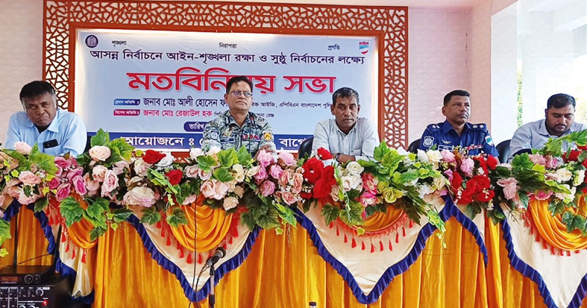 আসন্ন ১৩তম জাতীয় সংসদ নির্বাচনে আইনশৃঙ্খলা রক্ষা ও সুষ্ঠু নির্বাচনের লক্ষ্যে মত বিনিময় সভা অনুষ্ঠিত হয়েছে। গত বৃহস্পতিবার বিকেলে বাগেরহাট পুলিশ লাইন্সের ড্রিল শেডে বাগেরহাট জেলা পুলিশের আয়োজনে মতবিনিময় সভায় প্রধান অতিথি হিসেবে উপস্থিত ছিলেন অতিরিক্ত আইজিপি মো. আলী হোসেন ফকির। বাগেরহাট পুলিশ সুপার মো. আসাদুজ্জামানের সভাপতিত্বে মতবিনিময় সভায় বিশেষ অতিথি হিসেবে উপস্থিত ছিলেন খুলনা রেঞ্জ ডিআইজি মো. রেজাউল হক পিপিএম।