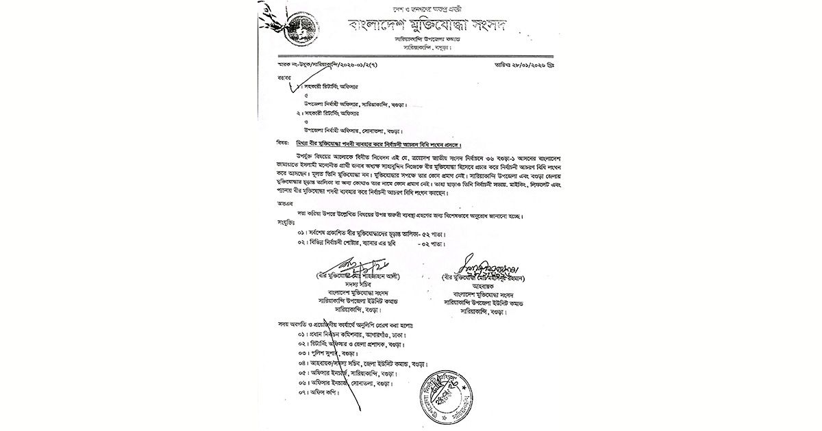 অভিযোগ সূত্রে জানাগেছে, অধ্যক্ষ শাহাবুদ্দিন তার নির্বাচনী জনসভা, মাইকিং, লিফলেট এবং ডিজিটাল প্যানায় নিজেকে ‘বীর মুক্তিযোদ্ধা’ হিসেবে প্রচার করছেন। তবে অনুসন্ধানে দেখা গেছে, সারিয়াকান্দি উপজেলা বা বগুড়া জেলার বীর মুক্তিযোদ্ধাদের চূড়ান্ত তালিকায় তার কোনো নাম নেই। এমনকি সরকারি কোনো গেজেট বা দালিলিক নথিতেও তার বীর মুক্তিযোদ্ধা হওয়ার সপক্ষে কোনো প্রমাণ পাওয়া যায়নি। নির্বাচনী প্রচারণায় এমন অসত্য তথ্য ব্যবহার করা ‘সংসদ নির্বাচনে রাজনৈতিক দল ও প্রার্থীর আচরণ বিধিমালা’র সুস্পষ্ট লঙ্ঘন। গেজেট ভুক্ত মুক্তিযোদ্ধাদের দাবি, নিজেকে ভুয়া পরিচয়ে বীর মুক্তিযোদ্ধা হিসেবে উপস্থাপন করে তিনি ভোটারদের আবেগ ও সহানুভূতি পাওয়ার চেষ্টা করছেন, যা নির্বাচন আইনত দণ্ডনীয় অপরাধ।