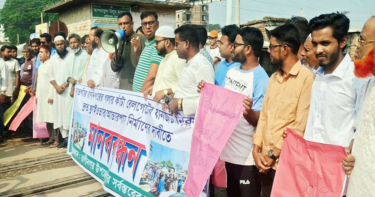 নওগাঁর রাণীনগরের গলার কাঁটা রেলগেটের যানজট নিরসনের লক্ষ্যে আন্ডারপাস কিংবা ফ্লাইওভার নির্মাণের দাবিতে উপজেলার সর্বস্তরের আমজনতারা মানববন্ধন করেছে। বৃহস্পতিবার উপজেলার রেলগেটে উপজেলার সর্বস্তরের মানুষের ব্যানারে ঘণ্টাব্যাপী এই মানববন্ধন অনুষ্ঠিত হয়।