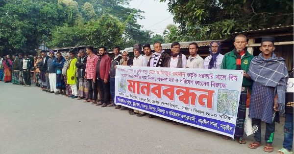নীলফামারীতে সেচ সংকট নিরসনে বুড়ি তিস্তা নদী ও জলাশয় দখল মুক্ত করে খননের দাবিতে মানববন্ধন করেছে সেচ সুবিধাবঞ্চিত কৃষকেরা। বৃহস্পতিবার (১১ ডিসেম্বর) বিকেলে জেলা প্রশাসকের কার্যালয়ের সামনে ঘণ্টাব্যাপী মানববন্ধন কর্মসূচি পালন করেন তারা। ওই কর্মসূচির সঙ্গে একাত্মতা প্রকাশ করে বাংলাদেশ পরিবেশ আন্দোলন (বাপা) ও তিস্তা নদী রক্ষা কমিটির সদস্যরা মানববন্ধনে অংশগ্রহণ করেন।