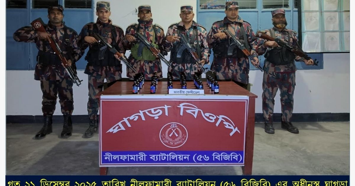 বিজিবি জানায়, বিশ্বাসযোগ্য সূত্রের তথ্যে অধিনায়ক, নীলফামারী ব্যাটালিয়নের (৫৬ বিজিবি) নির্দেশনায় ঘাগড়া বিওপির একটি বিশেষ টহল দল হাবিলদার আবুল কালাম আজাদের নেতৃত্বে সীমান্ত পিলার ৭৫৪/২-এস-সংলগ্ন এলাকায় অভিযান চালায়। এ সময় ভারত থেকে বাংলাদেশে চোরাচালানকৃত ২৯ বোতল ফেনসিডিল মালিকবিহীন অবস্থায় উদ্ধার করা হয়। উদ্ধার ফেনসিডিলের আনুমানিক মূল্য ১১ হাজার ৬০০ টাকা।