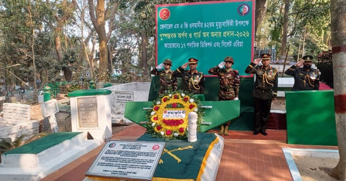 মহান মুক্তিযুদ্ধের সর্বাধিনায়ক জেনারেল (অব.) এম এ জি ওসমানীর ৪২তম মৃত্যুবার্ষিকী পালিত হয়েছে। সোমবার (১৬ ফেব্রুয়ারি) বাংলাদেশ সেনাবাহিনীর পক্ষ থেকে হযরত শাহজালাল (রহ.) মাজার কবরস্থানে ওসমানীর সমাধিতে পুষ্পস্তবক অর্পণ করেন ১৭ পদাতিক ডিভিশনের এরিয়া কমান্ডার মেজর জেনারেল মো. আলীমুল আমীন।