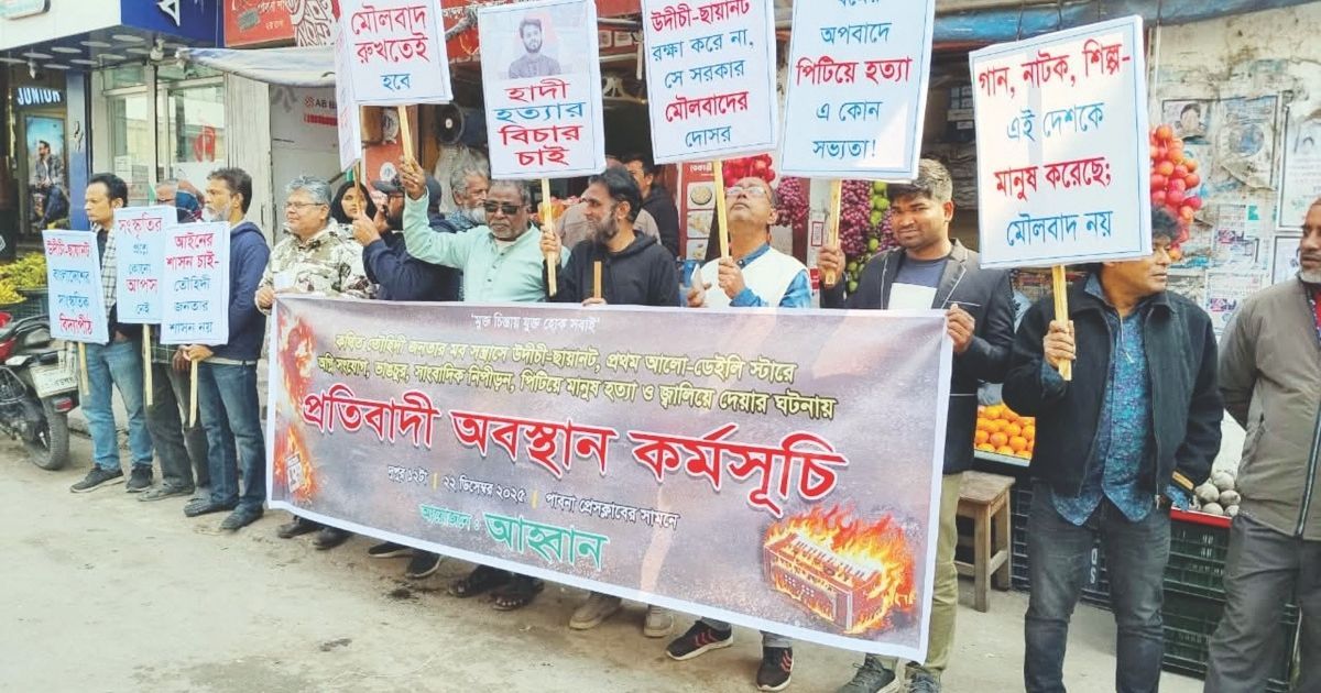 দেশব্যাপী মব সন্ত্রাসে উদীচী-ছায়ানট, প্রথম আলো-ডেইলি স্টারে অগ্নি সংযোগ, ভাঙচুর, লুটপাট, সাংবাদিক নিপীড়ন, পিটিয়ে মানুষ হত্যা, জ্বালিয়ে দেওয়ার প্রতিবাদে পাবনায় প্রতিবাদী অবস্থান করেছেন বিভিন্ন সাংস্কৃতিক সংগঠন সুশীল সমাজের নেতাকর্মীরা। সোমবার (২২ ডিসেম্বর) সকাল ১১টায় শহরের আব্দুল হামিদ সড়ক প্রেসক্লাবের সামনে সাংস্কৃতিক কর্মী মির্জা রানার আয়োজনে আহ্বান ঘণ্টাব্যাপী এ প্রতিবাদী অবস্থান কর্মসূচি অনুষ্ঠিত হয়। ওই সভায় দেশের চলমান সহিংসতা মাধ্যমে গুম, খুন, লুটপাট, জ্বালাও-পোড়াও এবং মব সৃষ্টির মাধ্যমে অস্থিতিশীল পরিস্থিতি সৃষ্টি করার প্রতিবাদে হুশিয়ারি দেওয়া হয়। এবং সেইসাথে এসব অরাজকতার বিরুদ্ধে জনগণকে সাথে নিয়ে কঠোর কর্মসূচির ঘোষণা দেওয়া হয়। ওই প্রতিবাদ সভায় উপস্থিত ছিলেন সাংস্কৃতিক কর্মী ভাস্কর চৌধুরী, সিরাজুল ইসলাম হীরা, ফিরোজ খন্দকার, দিবাকর চক্রবর্তী, তিমির হায়দার, আবদুল হাফিজ রতন, বিপ্লব ভৌমিক, সামুন সাব্বির সহ পাবনার বিভিন্ন সাংস্কৃতিক সংগঠন সুশীল সমাজের নেতাকর্মীরা।