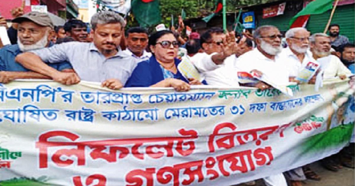 ত্রয়োদশ জাতীয় সংসদ নির্বাচনে নেত্রকোনা-২, সদর-বারহাট্রা আসনে ধানের শীষ মনোনীত প্রার্থীকে বিজয়ী করার লক্ষে সোমবার জেলা শহরে লিফলেট বিতরণ ও গণসংযোগ কর্মসূচী অনুষ্ঠিত হয়েছে। কর্মসূচীতে বিএনপি ও অঙ্গ সংগঠনের হাজার হাজার নেতাকর্মী অংশগ্রহণ করেন। মিছিলটির নেতৃত্ব দেন কেন্দ্রীয় বিএনপির সহ-ধর্মবিষয়ক সম্পাদক এটিএম আব্দুল বারী ড্যানী। মিছিলটি জেলা শহরের কোর্ট স্টেশন প্রাঙ্গণ থেকে শুরু করে শহরের প্রধান প্রধান সড়ক প্রদক্ষিণ করে চকপাড়া ঈদগাহ মাঠে গিয়ে শেষ করে। পরে লিফলেট বিতরন কর্মসূচী উদ্ধোধনকালে সংক্ষিপ্ত বক্তব্য রাখেন বিএনপির মনোনয়ন প্রত্যাশী জেলা বিএনপির সাবেক সভাপতি ও সাবেক এমপি বীর মুক্তিযোদ্ধা মো. আশরাফ উদ্দিন খান, কেন্দ্রীয় জাতীয় নির্বাহী কমিটির সদস্য ডক্টর আরিফা জেসমিন নাহীন। সাবেক সহসভাপতি আব্দুল মান্নান তালুকদার, জেলা বিএনপির নেতা আব্দুল্লাহ আল মামুন খান রনি, জেলা বিএনপির সাবেক সভাপতি ও সাবেক এমপি বীর মুক্তিযোদ্ধা মো. আশরাফ উদ্দিন খান বলেন, বিএনপির ভারপ্রাপ্ত চেয়ারম্যান তারেক রহমান ত্রয়োদশ জাতীয় সংসদ নির্বাচনে এ আসনে যাকেই মনোনয়ন দিবেন আমরা তাকেই ঐক্যবদ্ধভাবে বিজয়ী করব। নির্বাচনকে সামনে রেখে পলাতক ফ্যাসিস্টরা এখনো ষড়যন্ত্র করছে। আমাদের ভারপ্রাপ্ত চেয়ারম্যান তারেক রহমান সকলকে ঐক্যের বিকল্প নেই বলে ইতোমধ্যে আহ্বান জানিয়েছেন। দল থেকে যাকেই ধানের শীষ মনোনয়ন দিবেন তার জন্য আমরা সকলকে সঙ্গে নিয়ে কাজ করে যাব। আগামী নির্বাচনকে সামনে রেখে আমাদেরকে আরও সতর্ক থাকতে হবে। জনগণের ভোটের অধিকার প্রতিষ্ঠায় ফেব্রুয়ারি মাসেই জাতীয় সংসদ নির্বাচন হতে হবে। বিএনপির অঙ্গ সহযোগী সংগঠনের নেতাকর্মীরা উপস্থিত ছিলেন।