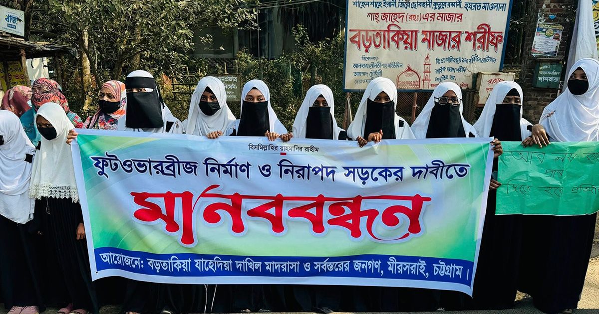 চট্টগ্রামের মীরসরাইয়ে ফুটওভার ব্রিজের (পদচারীসেতু) দাবিতে মানববন্ধন হয়েছে। বৃহস্পতিবার (২৯ জানুয়ারি) সকালে উপজেলার বড়তাকিয়া বাজার এলাকায় এ কর্মসূচি হয়। ওই এলাকায় বুধবার (২৮ জানুয়ারি) ট্রাকচাপায় মাদরাসাছাত্রী ও পথচারী নিহত হয়েছিলেন।