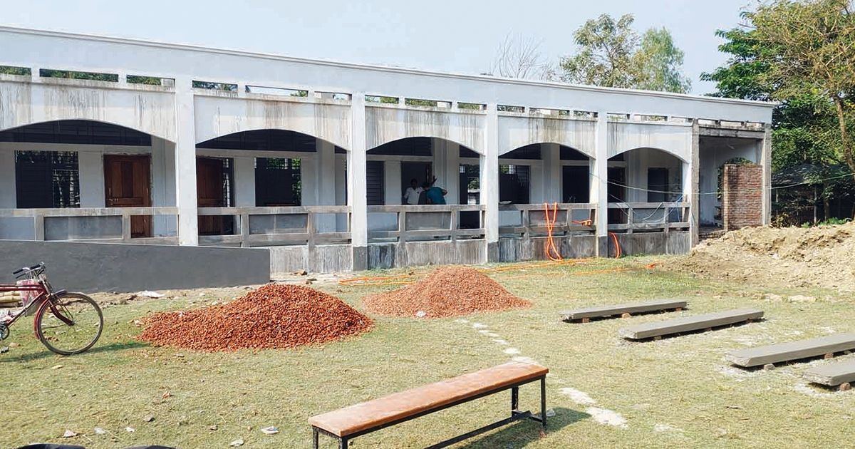 সরেজিমেন দেখা যায়, বিল্ডিংয়ের ঢালাই, প্লাস্টার, রং, দরজা-জানালা তৈরির জন্য কাঠমিস্ত্রি, ইলেকটিক মিস্ত্রি এবং টাইলস মিস্ত্রি এক দ্রুত কাজ করছেন। ঢালাইয়ের ব্যবহৃত পানিতে কর্দমাক্ত উচ্চবিদ্যালয়ের ভেতরের মাঠ। এর মধ্যে শিক্ষার্থীরা কষ্ট করে ক্লাস করছেন।