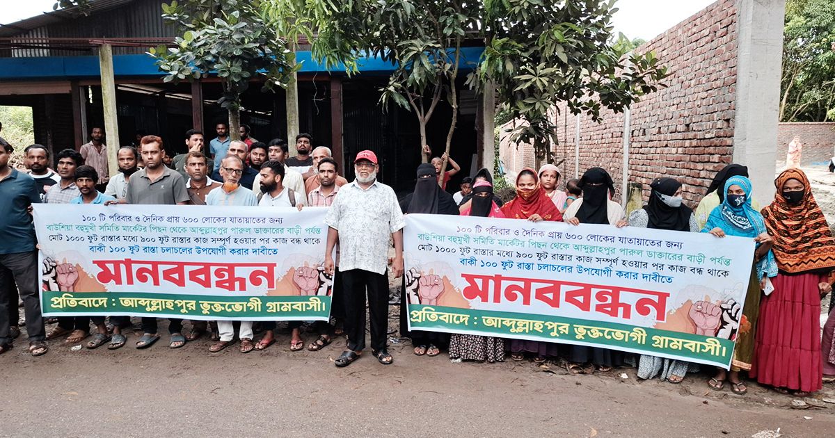 মানববন্ধনে অংশ নিয়ে স্থানীয় বাসিন্দা দোলোয়ার হোসেন, শুধু দুটি পরিবারের জন্য আমরা প্রায় একশটি পরিবারের ছয় শতাধিক সদস্য অবর্ণীয় দুর্ভোগে রয়েছি। বারবার তাদের রাস্তার জন্য জায়গা ছেড়ে দিতে অনুরোধ করা হলেও তারা আমাদের অনুরোধ প্রত্যাখ্যান করেছেন। এখন জনগণের রাস্তার জায়গা বন্ধ করে ওই জায়গায় স্থাপনা নির্মাণ করার পরিকল্পনা করছে তাই বাধ্য হয়ে আমাদের এই প্রতিবাদ কর্মসূচি।