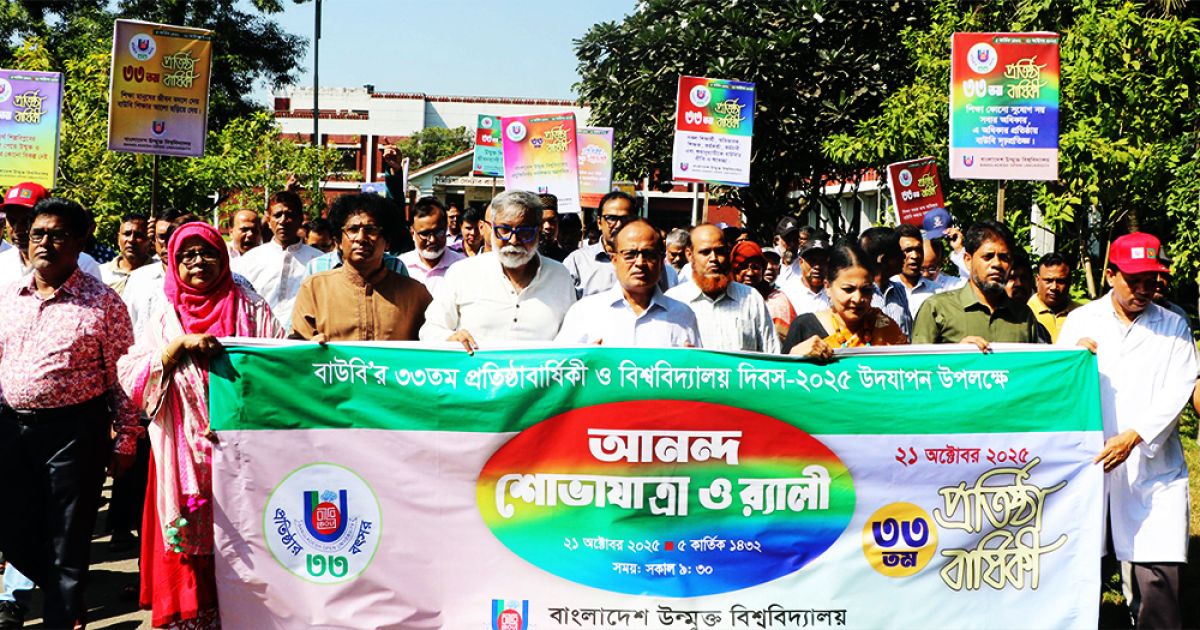 বাংলাদেশ উন্মুক্ত বিশ্ববিদ্যালয়ের (বাউবি) ৩৩তম প্রতিষ্ঠাবার্ষিকী ও বিশ্ববিদ্যালয় দিবস-২০২৫ মঙ্গলবার গাজীপুর ক্যাম্পাসে উৎসবমুখর ও আনন্দঘন পরিবেশে পালিত হয়েছে। দিনব্যাপী নানা বর্ণাঢ্য কর্মসূচি ও অনুষ্ঠান আয়োজনের মধ্য দিয়ে দিবসটি উদযাপন করা হয়। মঙ্গলবার সকাল ৯টায় জাতীয় পতাকা ও বাউবি পতাকা উত্তোলনের মধ্য দিয়ে দিবসের কর্মসূচির উদ্বোধন করেন বিশ্ববিদ্যালয়ের উপাচার্য অধ্যাপক ড. এ বি এম ওবায়দুল ইসলাম। তার সঙ্গে প্রো-উপাচার্য (শিক্ষা) অধ্যাপক ড. দিল রওশন জিন্নাত আরা নাজনীন, প্রো-উপাচার্য (প্রশাসন) অধ্যাপক সাঈদ ফেরদৌস, ট্রেজারার, রেজিস্ট্রার, বিভিন্ন অনুষদের ডিন, পরিচালক, শিক্ষক, কর্মকর্তা ও কর্মচারীরা উপস্থিত ছিলেন। পরে শান্তির প্রতীক সাদা পায়রা ও রঙিন বেলুন উড়িয়ে অনুষ্ঠানের আনুষ্ঠানিক উদ্বোধন করা হয়।