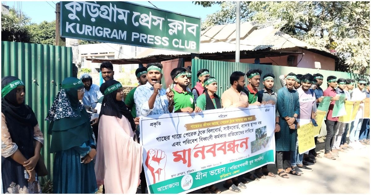 গাছেরও জীবন আছে, পেরেক ঠুকে আঘাত বন্ধ করুন” এই স্লোগান তুলে মানববন্ধনে বক্তারা পরিবেশ সচেতনতা বৃদ্ধি এবং রাজনৈতিক ব্যক্তি, ডাক্তার, ক্লিনিক, ডায়াগনস্টিক, কোচিং ও স্কুল-কলেজসহ বিভিন্ন প্রতিষ্ঠানের দৃষ্টি আকর্ষণ করে গাছে সাইনবোর্ড, ফেস্টুন ঝুলানো বন্ধকরণ এবং অবিলম্বে সেগুলো সরিয়ে নেওয়ার দাবীতে মানববন্ধন অনুষ্ঠিত হয়েছে। বুধবার ১৯ নভেম্বর সকালে কুড়িগ্রাম প্রেসক্লাবের সামনে পরিবেশবাদী যুব সংগঠন গ্রীন ভয়েস একটি মানববন্ধন করে।