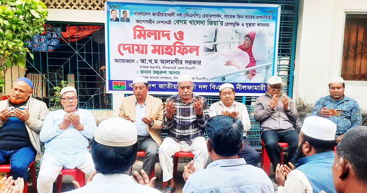 নীলফামারী প্রতিনিধি: বিএনপির চেয়ারপারসন বেগম খালেদা জিয়ার রোগমুক্তি ও সুস্থতা কামনায় নীলফামারীতে মিলাদ ও দোয়া মাহফিল অনুষ্ঠিত হয়েছে। রোববার বিকেলে জেলা বিএনপির সাবেক সভাপতির বাসভবনে সাবেক নেতাকর্মীদের উদ্যোগে এ অনুষ্ঠানের আয়োজন করা হয়।