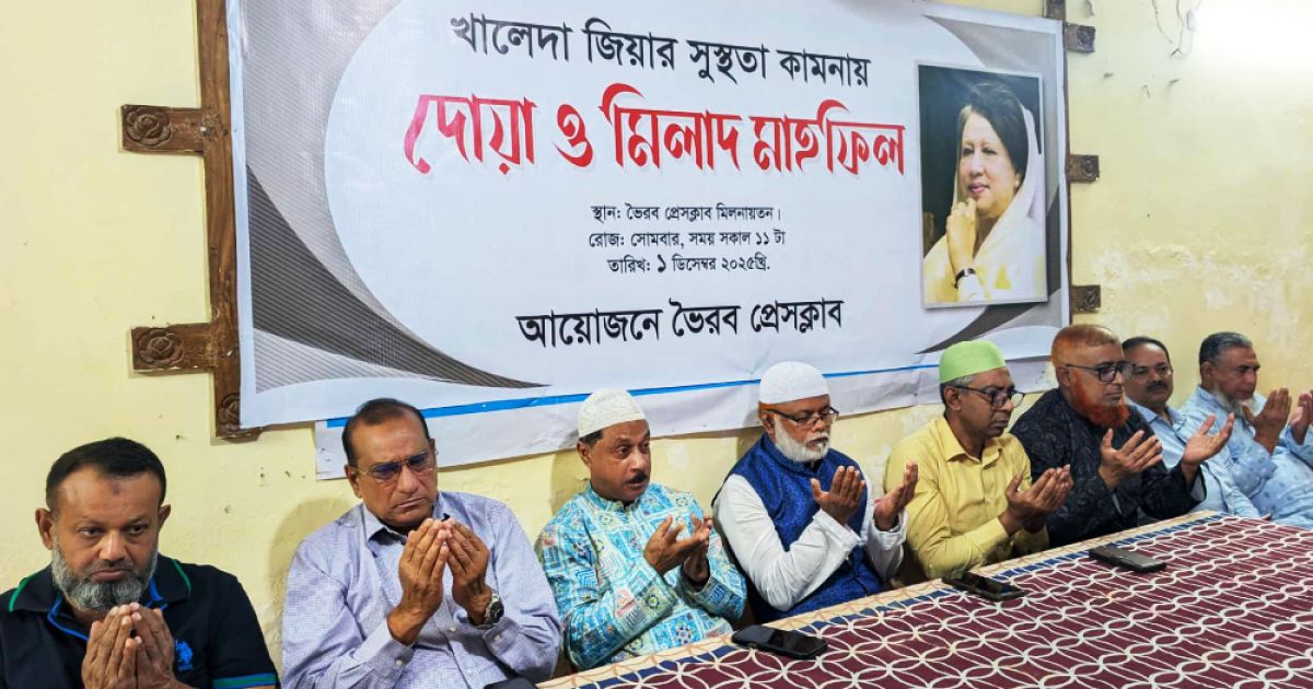 বিএনপির চেয়ারপারসন ও সাবেক প্রধানমন্ত্রী বেগম খালেদা জিয়ার রোগমুক্তি কামনায় দোয়া ও আলোচনা সভা হয়েছে। সোমবার দুপুরে ভৈরব প্রেসক্লাবের আয়োজনে আলোচনা সভা ও দোয়া মাহফিল হয়েছে।