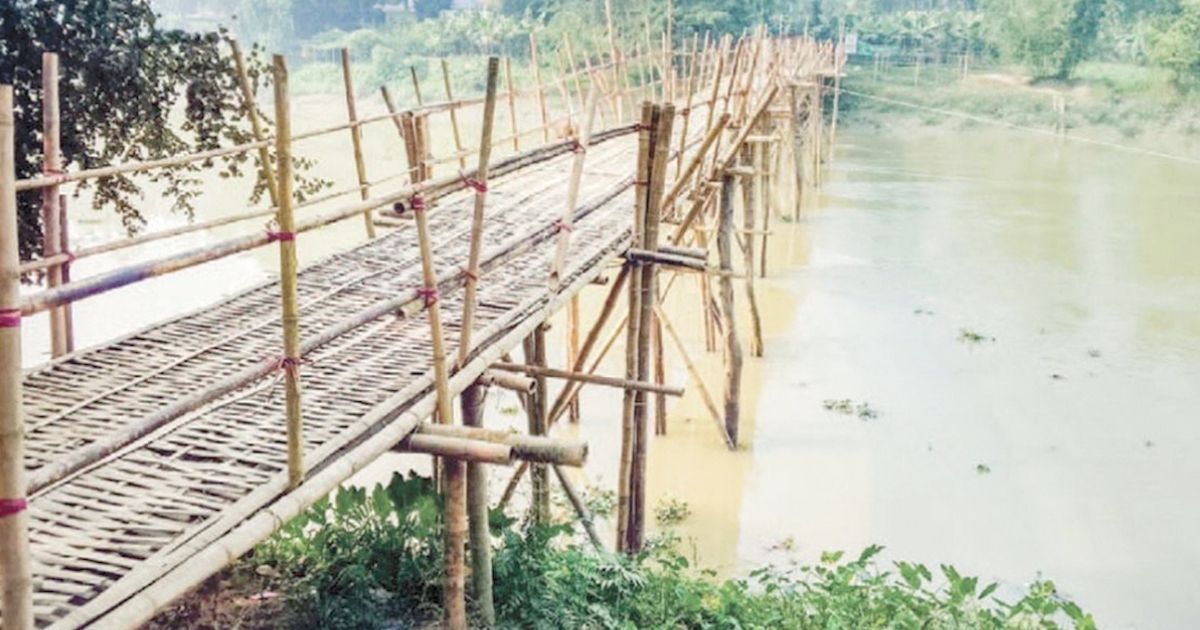 উত্তর চট্টগ্রামের রাউজান উপজেলার পশ্চিম ফতেহ নগর, ফটিকছড়ির দক্ষিণ নিচিন্তাপুর হাটহাজারীর লাঙ্গলমোড়া বাজারের সীমানায় হালদা নদীর উপর ঝুঁকিপূর্ণ বাঁশের তৈরি সাঁকো | ছবি: দৈনিক বাংলা