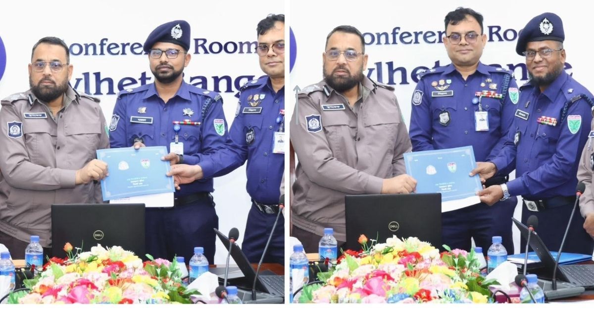 গত বৃহস্পতিবার (৫ ফেব্রুয়ারি) সিলেট রেঞ্জ পুলিশ কার্যালয়ের সম্মেলন কক্ষে অনুষ্ঠিত মাসিক অপরাধ পর্যালোচনা সভায় রেঞ্জ ডিআইজি মো. মুশফেকুর রহমান দুই কর্মকর্তার হাতে পুরস্কার তুলে দেন।